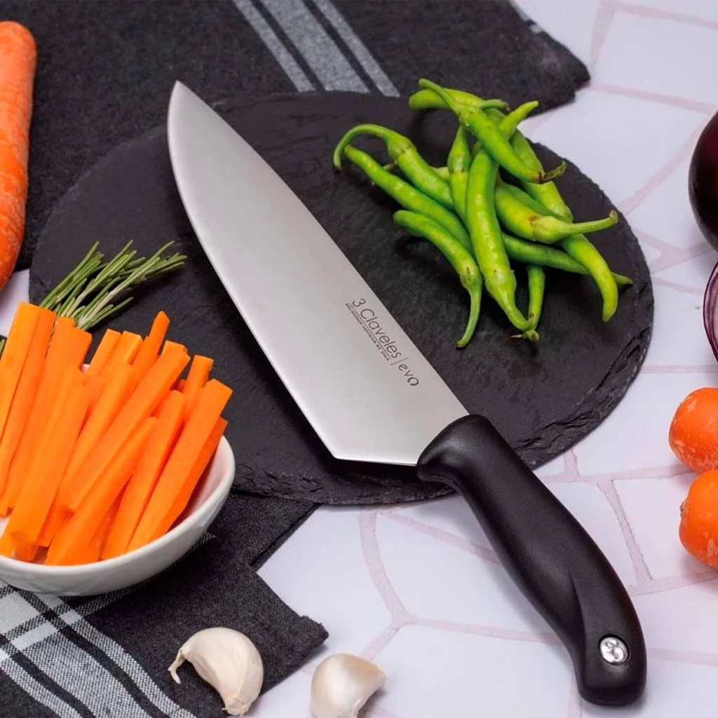 Potencia, precisión y diseño en una sola pieza. El Cuchillo Cocinero Evo de 3 Claveles —también conocido como cebollero o de chef— es la herramienta esencial para todo tipo de preparaciones. Su hoja ancha de acero inoxidable con filo liso ofrece cortes firmes y precisos, ideal para carnes, vegetales, aves y pescados.